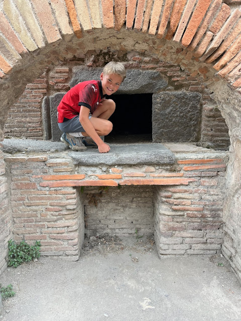 It was amazing to see how preserved the town was in so many ways. You could still see frescoes on the walls of homes and the colors in mosaic tiles. We visited the "garden of the fugitives" where a lot of body casts were made from the lava that had hardened around victims as they tried to escape Pompeii. It was truly fascinating. I'm sure touring with a professional guide would have been so neat and informative. However, we had already paid for a tour of the colosseum, so we needed to do Pompeii more affordably. We showed ourselves around and a we packed a picnic lunch for the day. There is so much to see there that we really only scratched the surface. The kids got in for free and Charlie and I paid online for "skip the line tickets." It was definitely worth it because the line was very long to purchase tickets on site. We still had to visit a second ticket booth with our kids to show they were minors and qualified for free entry. However, that second booth did not have a long line, so overall it was worth it to pay online to skip the line at the gate. I recommend going as early as possible as I can only imagine it would get super hot as the day wears on. We were blessed with a cloudy/almost misty day, so we were never hot. That was unusual weather for that part of Italy in July, but we were very grateful!